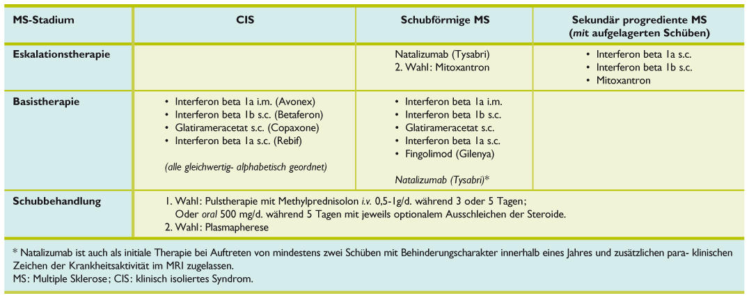 Für die verlaufsmodifizierende Therapie sind Glatirameracetat sowie Interferon beta-1a und Interferon beta-1b zugelassen wenn ein hohes Risiko für den Übergang in eine Multiple Sklerose besteht. Gibt es einen Nachteil bei der Einnahme von Minocyclin.