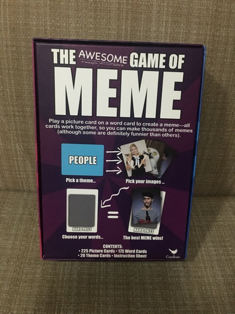 Shop The Awesome Game of Meme at Toy Kingdom. The way to play if is by placing three Word Cards face up on the table and then the players have to pick Picture Cards to create a meme as quickly as you can then pick the cards and set them aside.