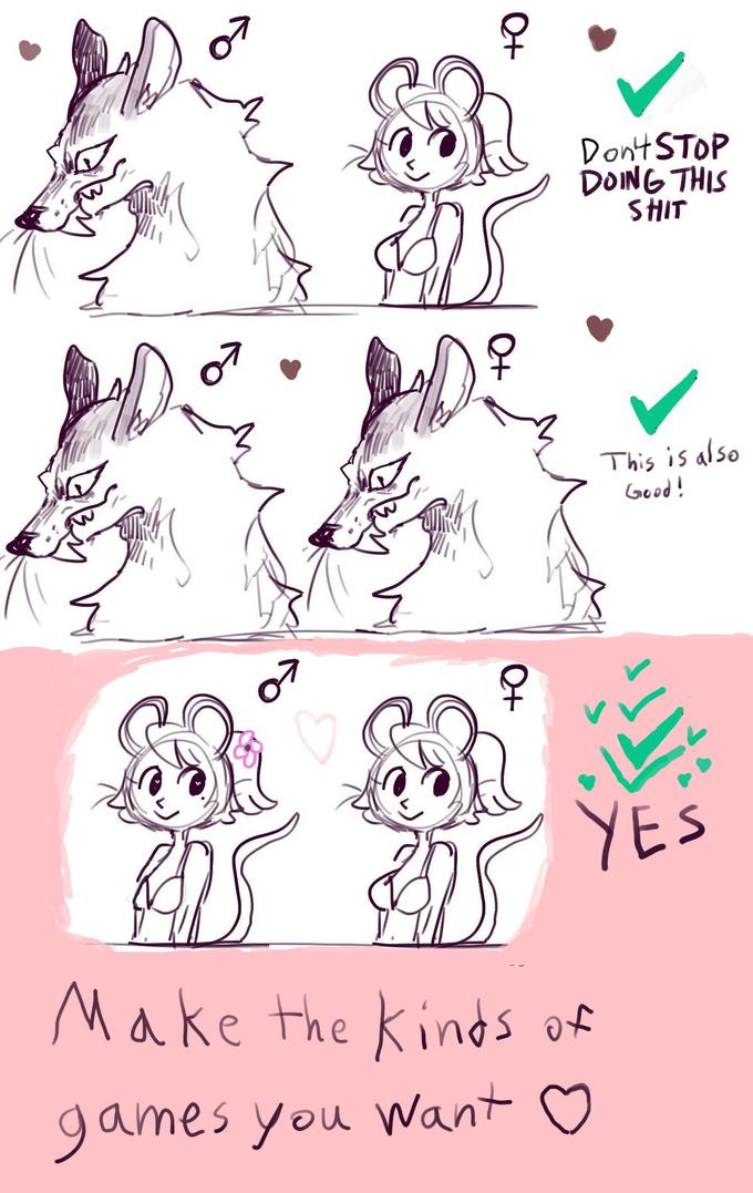 On July 6th 2017 Twitter user glitchedpuppet tweeted a short comic about the extreme sexual dimorphism presented in video games juxtaposing a male anthropomorphic rodent creature with a female variation shown.